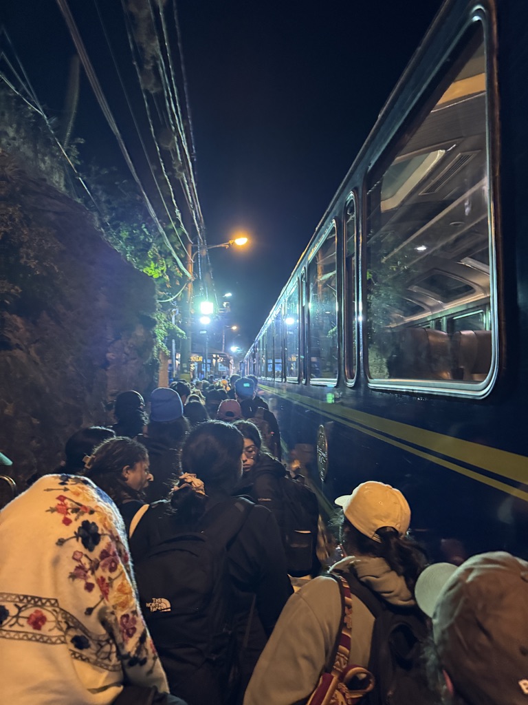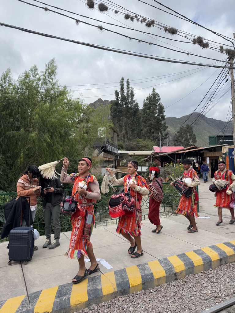 秘鲁在某些瞬间真的很像几十年前的中国,除了快要掉皮的慢速火车之外,还有登上火车前的步骤,每节车厢的旅客要提前在等候室按照车厢字母顺序排队,然后会有穿着制服的工作人员举着牌子一队一队按顺序带路去登车,像极了运动会开幕式里举牌走方阵,又像小时候放学,按照班级顺序乖乖跟着值周班长排队出校门的样子。登车的几百米路上,铁路公司的工作人员载歌载舞,唱着古老的印加音乐,给足了气氛,让我觉得这张五百多人民币的车票值回了一点点。又有很多当地老人小孩和妇女就这样沿街排成一排,鼓掌唱歌挥挥手,亲切地看着、微笑,眼神里充满着新奇和热情,也增添了几分仿佛在上个世纪的气息。