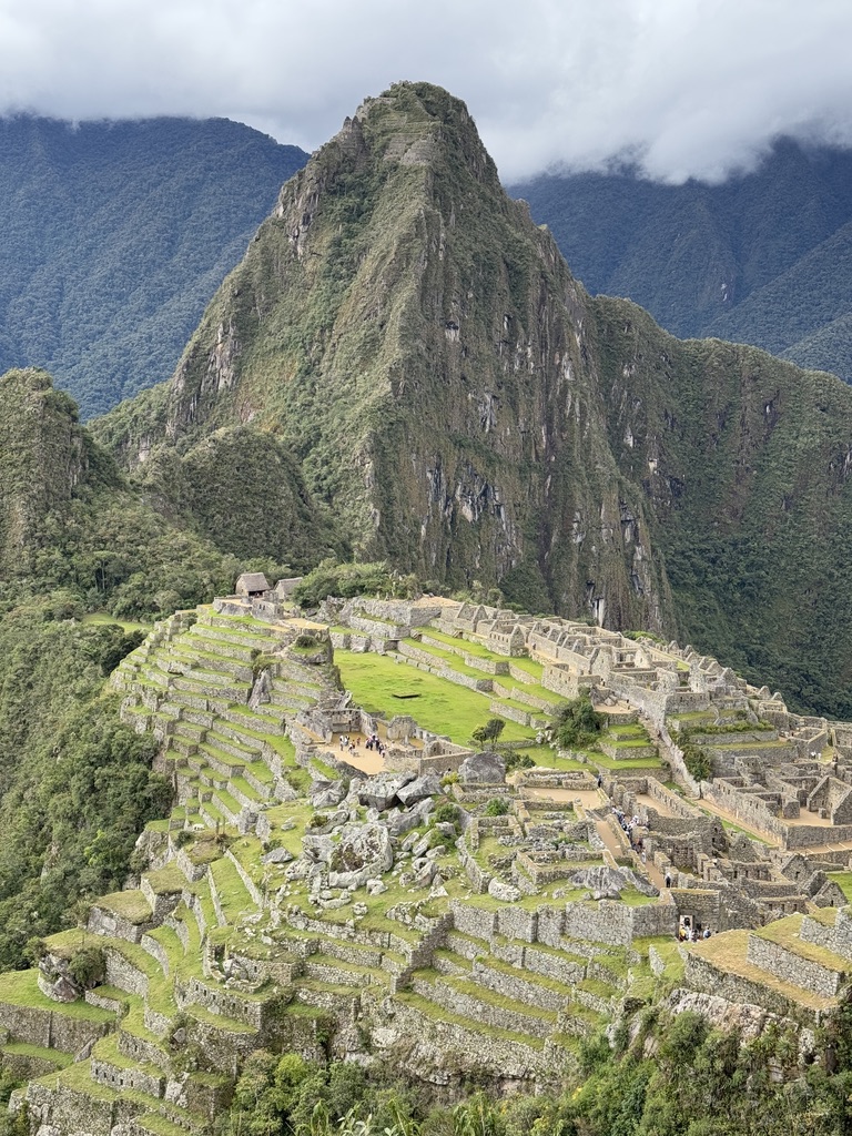 第二天的我们终于登上这马丘比丘了。真的看到图片中的那个地方出现在我的眼前的时候,好像并没有那么的惊讶和震撼,倒是发现这山顶的高原确实处处飘荡着我曾经专门买过的秘鲁圣木的香气。巴士沿着盘山公路从山脚下的热水镇一路盘到马丘比丘山的山顶,渐渐发现头顶只剩下天空和白云了,奔涌的乌日庞巴河踩在了几百米的脚下,而我们真正来到了群山之巅。